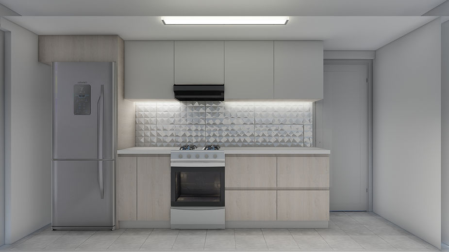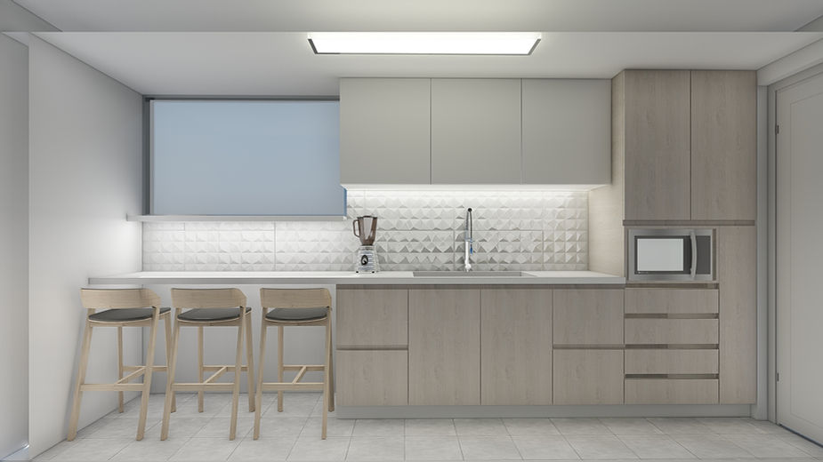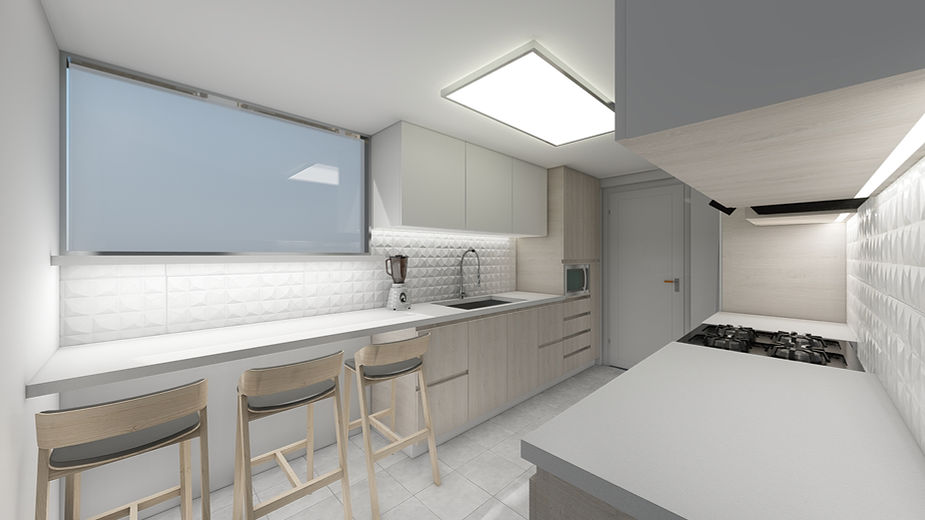 Se decidió ahorrar el presupuesto de cambio de piso y en la compra de nuevos electrodomésticos, a cambio; incorporaremos una barra en la cocina, que sirve como comedor diario para la familia. El diseño integral de la iluminación también es una parte importante del proyecto. Se instalaran luces generales en el ambiente, así como luces funcionales y decorativas en los muebles que crean una cocina moderna y cálida.