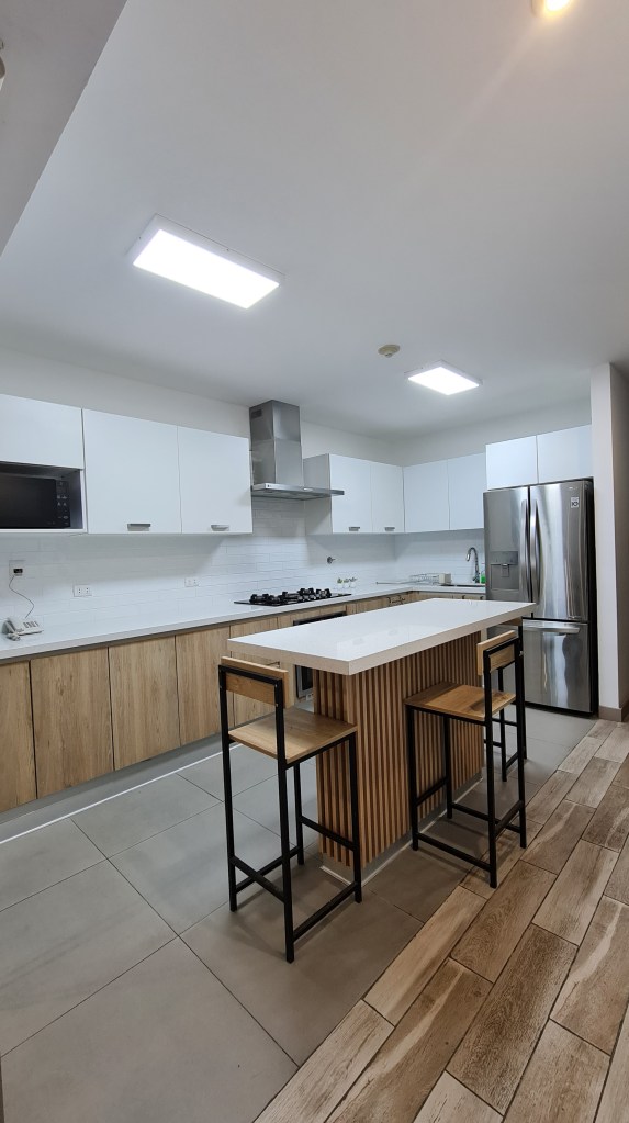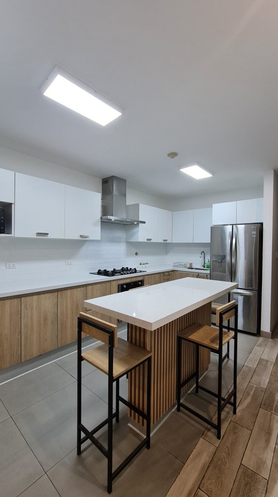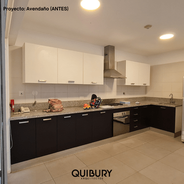 Empezamos diseñando la cocina; no les gustaba los colores oscuros que tenia; necesitaban una isla que les sirviera de mesa de diario y mayor espacio de almacenamiento, entre otros pedidos.